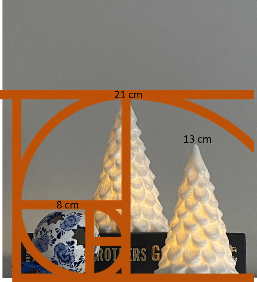Chamado de proporção áurea, divina proporção ou razão de ouro, ela se resume ao valor arredondado a três casas decimais de 1.618. Ou seja, se quiser fazer uma composição de 3 objetos, conforme apresentado na foto deste post, tem que escolher 1 objeto principal e 2 secundários que sejam harmoniosos e proporcionais entre si pela proporção áurea; i.e., se o objeto principal da composição tiver 21 cm, o segundo deverá ter aproximadamente 13 cm e o terceiro, aproximadamente 8 cm já que 21 cm*0.618 dá aproximadamente 13 cm e 13 cm*0.618 dá aproximadamente 8 cm. Se quiser adicionar um 4º elemento a essa composição que fosse maior do que os já existentes, então faria 21*1.618 que dá aproximadamente 34 cm, que é habitualmente o espaçamento livre entres as prateleiras.